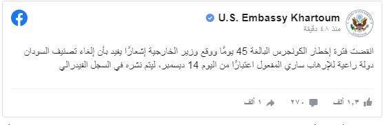 وذكرت السفارة الأميركية بالخرطوم في بيان مقتضب على صفحتها الرسمية على مواقع التواصل الاجتماعي "تويتر": "انقضت فترة إخطار الكونجرس البالغة 45 يوما ووقع وزير الخارجية إشعارا يفيد بأن إلغاء تصنيف السودان دولة راعية للإرهاب ساري المفعول اعتبارا من اليوم 14 ديسمبر ليتم نشره في السجل الفيدرالي".