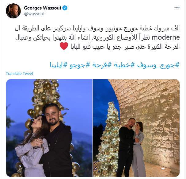 وكتب جورج وسوف تغريدة على تويتر: "الف مبروك خطبة جورج جونيور وسوف وايلينا سركيس على الطريقة ال moderne نظراً للأوضاع الكورونية. انشاء الله بتتهنوا بحياتكن وعقبال الفرحة الكبيرة حتى صير جدو يا حبيب قلبو للبابا.. #جورج_وسوف #خطبة #فرحة #جوجو #ايلينا"
