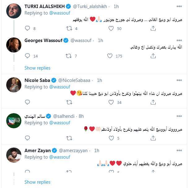 تفاعل مشاهير الفن مع فرحة المطرب اللبناني جورج وسوف مقدمين له التهاني، فكتب رئيس مجلس إدارة الهيئة العامة للترفيه تركي آل الشيخ "مبروك ابو وديع الغالي ... ومبروك لي جورج جونيور.. الله يوفقهم".