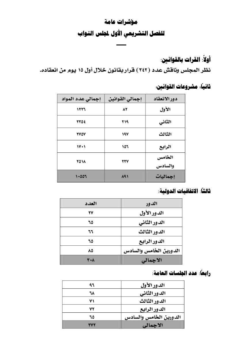 وبلغت الجلسات العامة 372 على مدار الفصل التشريعي الأول على النحو الآتي: