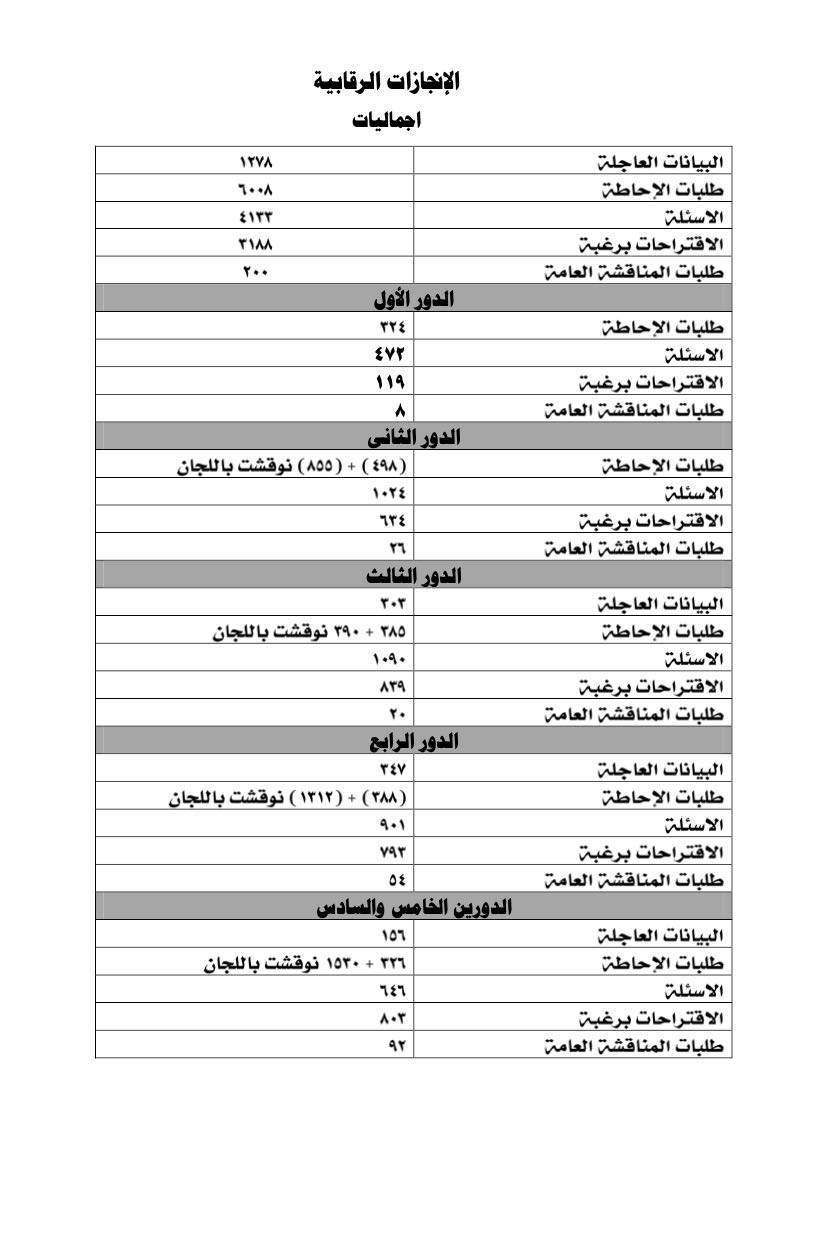 وفيما يتعلق بالدور الرقابي، بلغ عدد البيانات العاجلة 1278، وطلبات الإحاطة 6008، والاسئلة 4133، والاقتراحات برغبة 3188، وطلبات المناقشة العامة 200.