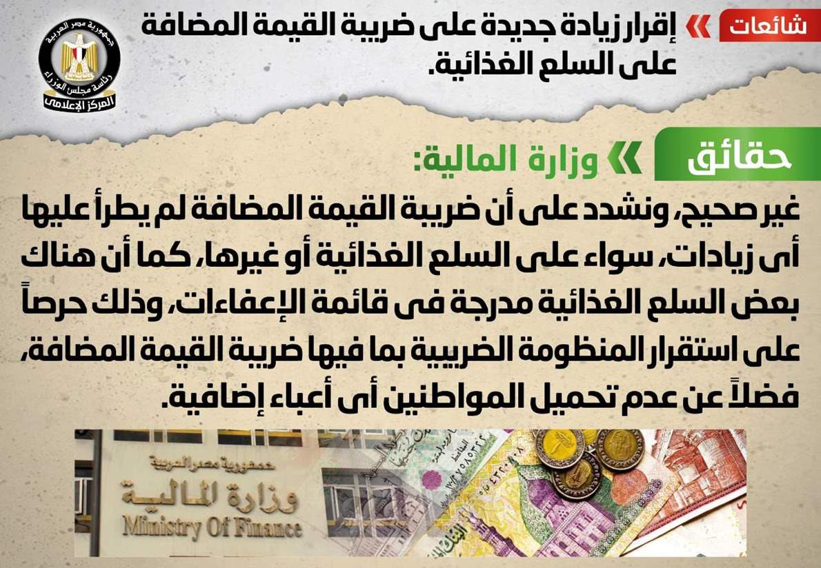 وقد قام المركز الإعلامي لمجلس الوزراء بالتواصل مع وزارة المالية، والتي نفت تلك الأنباء، مُؤكدةً أنه لا صحة لإقرار أي زيادة جديدة على ضريبة القيمة المضافة على السلع الغذائية، مُشددةً على أن ضريبة القيمة المضافة لم يطرأ عليها أي زيادات، سواء على السلع الغذائية أو غيرها.