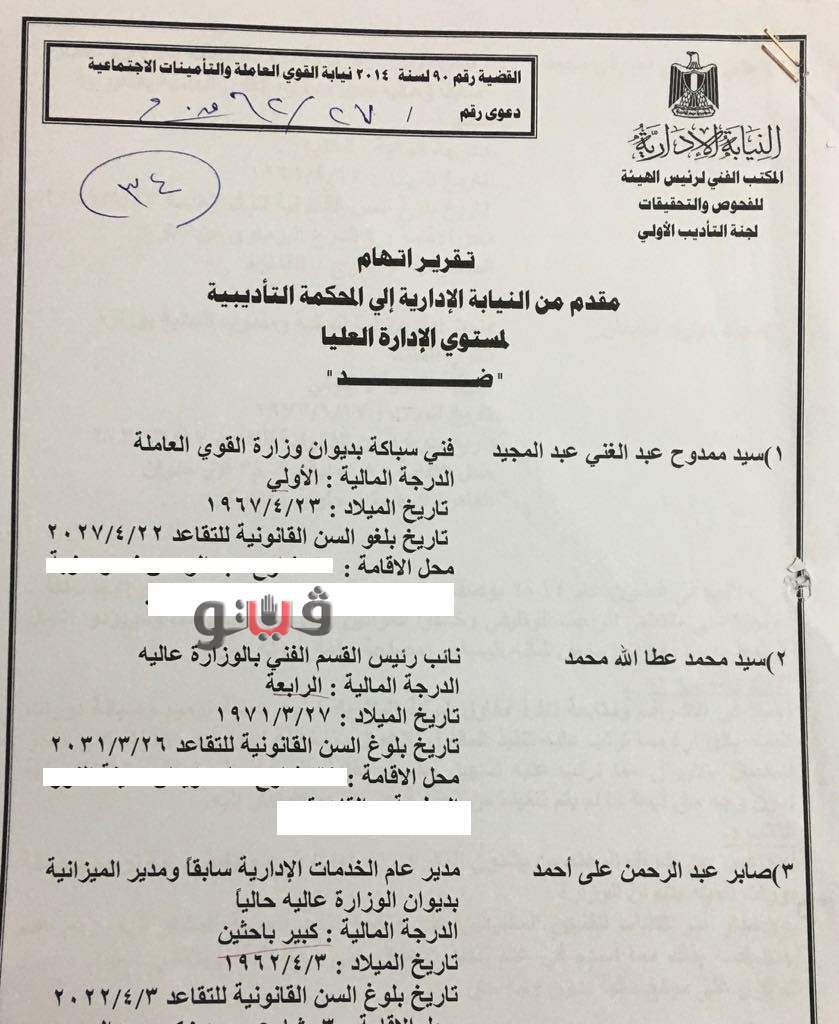 قررت النيابة الإدارية في القضية رقم 27 لسنة 62 قضائية عليا إحالة مدير مديرية القوى العاملة بمحافظة القليوبية ومدير الميزانية بالوزارة و3 آخرين للمحاكمة العاجلة بعد ثبوت ارتكابهم مخالفات مالية وإدارية جسيمة في عملية صيانة وتطوير دورات المياه بديوان عام الوزارة.