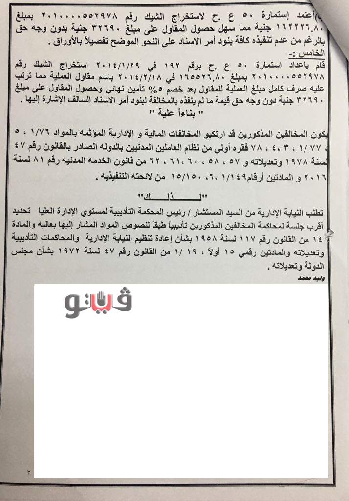 وأكدت النيابة الإدارية أن محمد مبارك سليمان، مندوب وزارة المالية بوزارة القوى العاملة قام بإعادة استمارة 50 ع ح بشأن استخراج شيك قيمته 166 ألف جنيه باسم مقاول العملية مما ترتب عليه صرف كامل مبلغ العملية للمقاول بعد خصم 5% تأمين نهائي بالمخالفة لبنود أمر الإسناد.