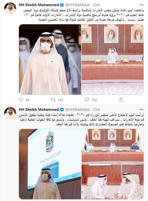 وقال: "اعتمدنا اليوم إعادة تشكيل مجلس الإمارات للتنافسية برئاسة الأخ محمد عبدالله القرقاوي ليبدأ المجلس عامه الجديد في ٢٠٢١ برؤية جديدة لترسيخ تنافسية دولة الإمارات .. الامارات الأولى عالمياً في ١٢١ مؤشر رئيسي .. والهدف مرحلة جديدة من التفوق العالمي للدولة مع بداية الخمسين الجديدة".