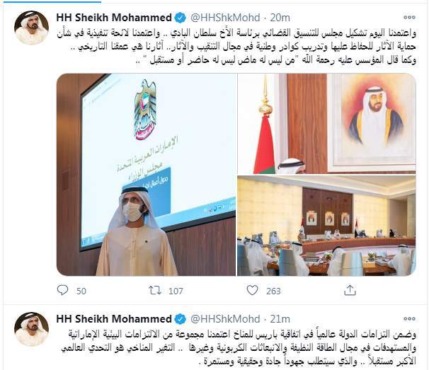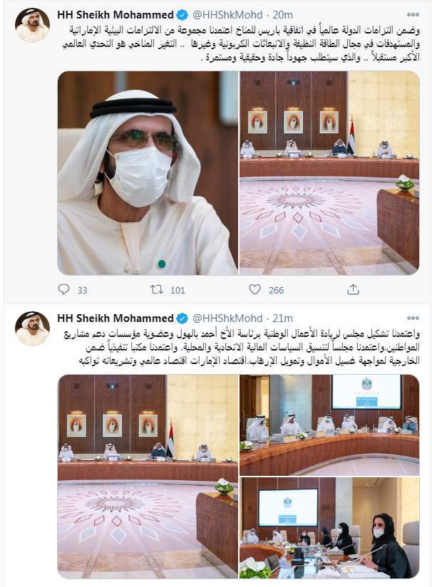 وقال الشيخ محمد بن راشد إن مجلس وزراء الإمارات اعتمد ضمن التزامات الدولة عالمياً في اتفاقية باريس للمناخ، حيث اعتمدت مجموعة من الالتزامات البيئية الإماراتية والمستهدفات في مجال الطاقة النظيفة والانبعاثات الكربونية.