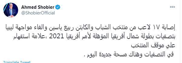 وكتب أحمد شوبير كتب تغريدة على تويتر قال فيها "إصابة ١٧ لاعبا من منتخب الشباب والكابتن ربيع ياسين والغاء مواجهة ليبيا بتصفيات بطولة شمال أفريقيا المؤهلة لأمم أفريقيا 2021 ،علامة استفهام علي موقف المنتخب في التصفيات وهناك مسحة جديدة اليوم"
