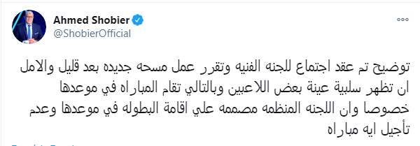 وكتب أحمد شوبير تغريدة على تويتر قال فيها " توضيح تم عقد اجتماع للجنه الفنيه وتقرر عمل مسحه جديده بعد قليل والامل ان تظهر سلبية عينة بعض اللاعبين وبالتالي تقام المباراه في موعدها خصوصا وان اللجنه المنظمه مصممه علي اقامة البطوله في موعدها وعدم تأجيل ايه مباراه"
