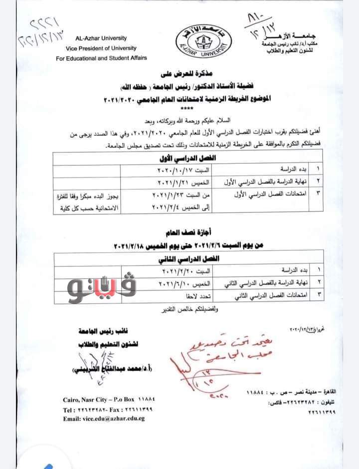 ونص قرار جامعة الأزهر، الذي حصلت "فيتو" على نسخة منه، على أن ينتهي الفصل الدراسي الأول يوم الخميس الـ٢١ من يناير، وتبدأ إجازة نصف العام يوم السبت السادس من فبراير وتنتهي الخميس الـ ١٨ من الشهر نفسه.