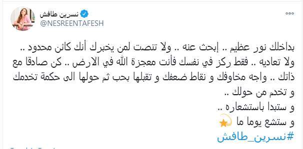 وكتبت نسرين طافش تغريدة على تويتر "بداخلك نور عظيم.. إبحث عنه.. ولا تنصت لمن يخبرك أنك كائن محدود.. ولا تعاديه.. فقط ركز في نفسك فأنت معجزة الله في الارض .. كن صادقا مع ذاتك.. واجه مخاوفك ونقاط ضعفك وتقبلها بحب ثم حولها الى حكمة تخدمك و تخدم من حولك.. وستبدا باستشعاره.. وستشع يوما ما"