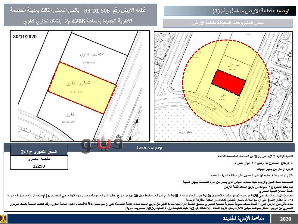 وتطرح بالعاصمة الإدارية أرضا بمساحة 3441 مترا بنشاط تجاري بسعر 15685 جنيها، وأرضا بمساحة 4266 مترا بنشاط تجاري إداري بسعر 12290 وأرضا بمساحة 9330 بنشاط تعليمي بسعر 5190 جنيها للمتر.