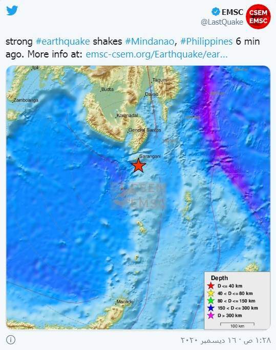 وأكد مركز المسح الجيولوجي الأمريكي، أن الزلزال الذي ضرب مينداناو في تمام الساعة " 23:21:59" بتوقيت جرينتش وقع على عمق 26.9 كم.