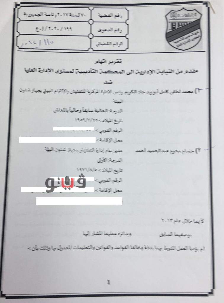 قررت النيابة الإدارية لرئاسة الجمهورية في القضية رقم 115 لسنة 62 قضائية عليا إحالة رئيس الإدارة المركزية للتفتيش والإلتزام البيئي بجهاز شئون البيئة ومدير عام إدارة التفتيش بالجهاز للمحاكمة العاجلة بعد ثبوت إرتكابهما مخالفات مالية وإدارية جسيمة، وعدم أداء العمل المنوط بهما بدقة وخالفا القواعد والقوانين والتعليمات المعمول بها