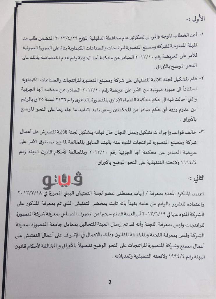 أعد محمد لطفي كامل، رئيس الإدارة المركزية للتفتيش والإلتزام البيئي بجهاز شئون البيئة الخطاب الموجه والمرسل إلى سكرتير عام محافظة الدقهلية المتضمن طلب مد المهلة الممنوحة لشركة ومصنع المنصورة للراتنجات والصناعات الكيماوية بناءً على الصورة الضوئية للأمر على عريضة الصادر من محكمة أجا الجزئية رغم عدم إختصاصه بذلك