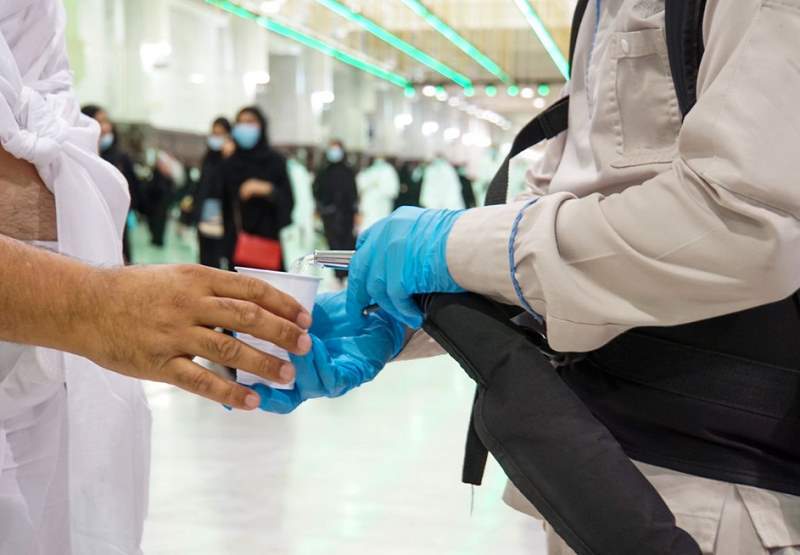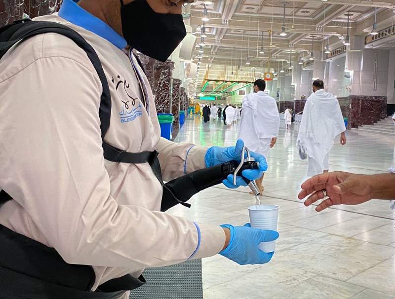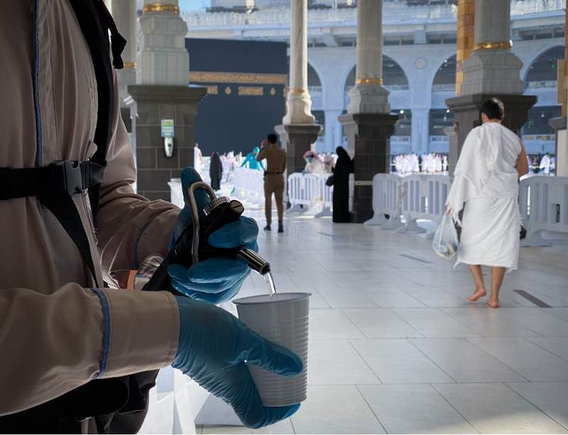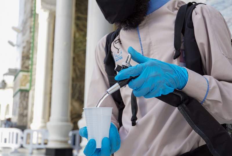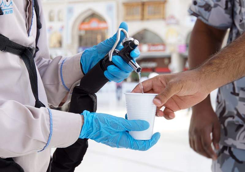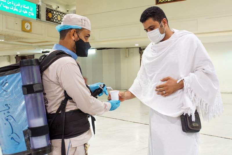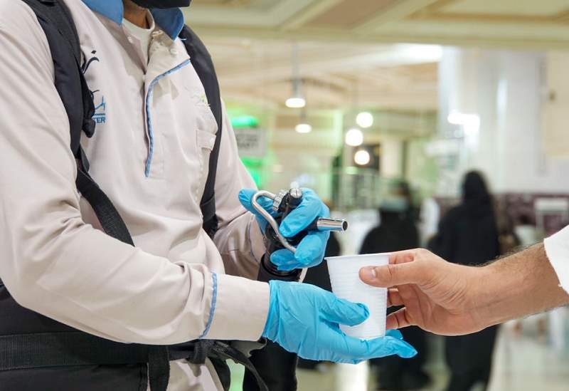 وقال مدير إدارة "سقيا زمزم" بالمسجد الحرام، أحمد الندوي: إن الإدارة قامت بتوزيع الماء المبارك على مرتادي ضيوف بيت الله الحرام وفق الإجراءات الاحترازية المطبقة داخل المسجد الحرام، من خلال 50 عاملا مزودين بحقائب المياه، وتحتوي كل حقيبة على 10 لترات من الماء المبارك و200 كوب بلاستيكي ذات الاستخدام الواحد.