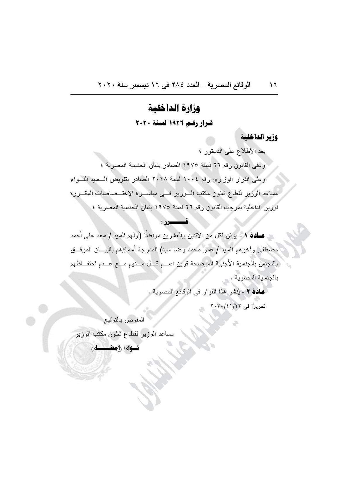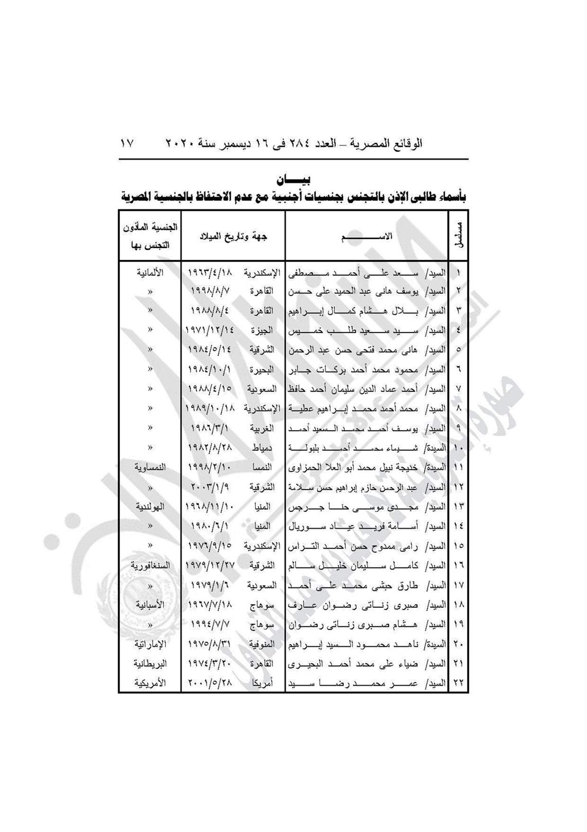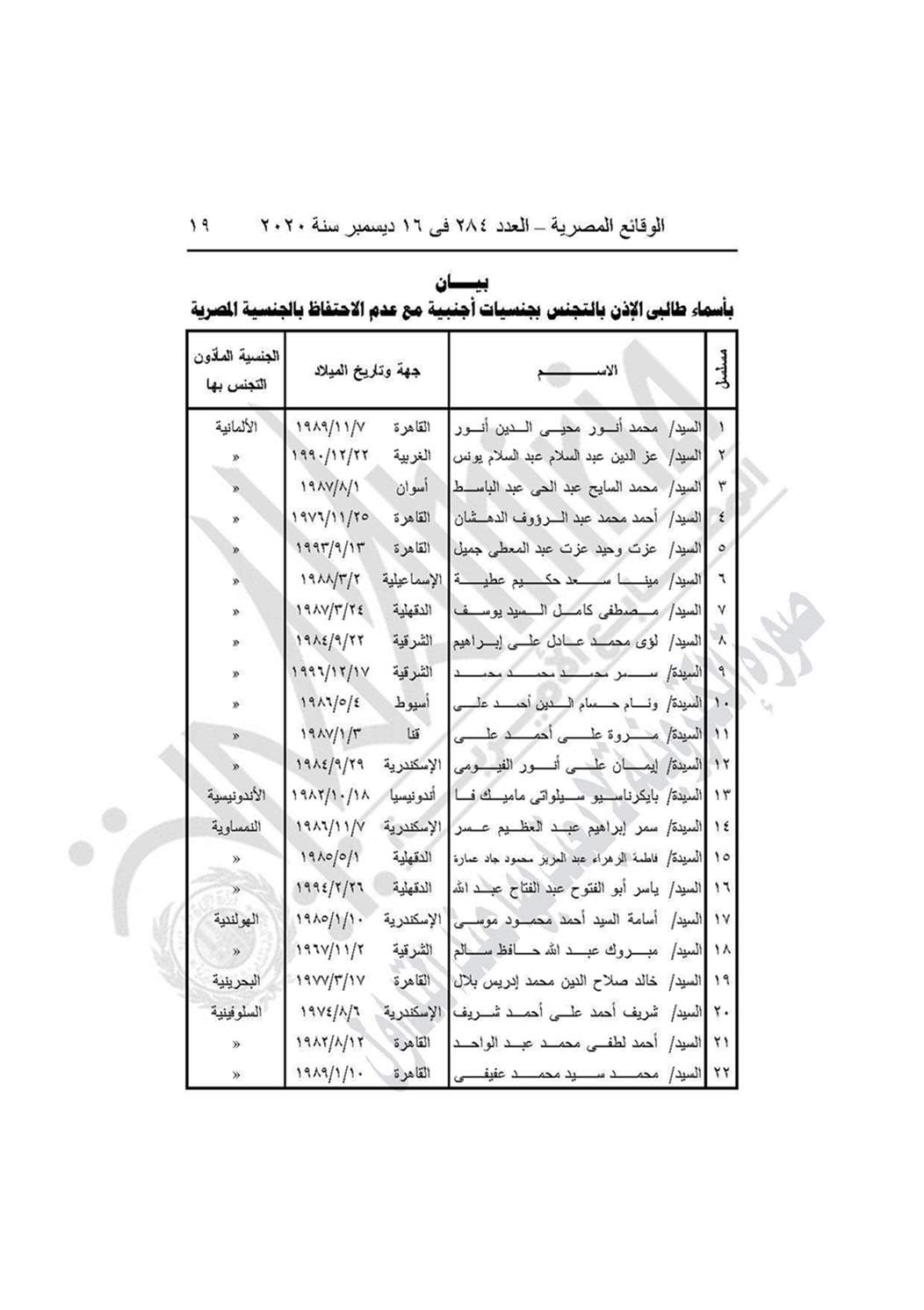 نشرت الجريدة الرسمية في عددها رقم 284، الصادر في 16 ديسمبر 2020، قراري وزارة الداخلية بشأن الإذن لـ44 بالتجنس بالجنسية الأجنبية الموضحة قرين اسم كل منهم مع عدم احتفاظهم بالجنسية المصرية.