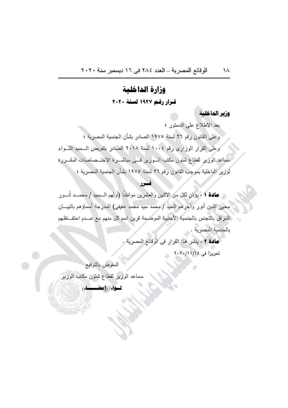 والقرار رقم 1927 لسنة 2020، بالإذن لـ22 مواطنًا (أولهم محمد أنور محيي الدين أنور، وآخرهم محمد سيد محمد عفيفي) المدرجة أسماؤهم بالبيان، بالتجنس بالجنسية الأجنبية الموضحة قرين اسم كل منهم مع عدم احتفاظهم بالجنسية المصرية.