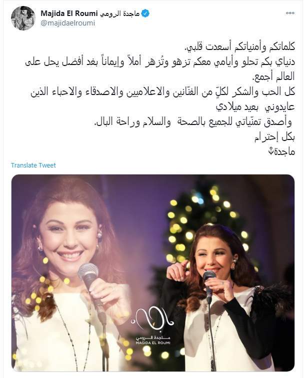 وكتبت ماجدة الرومي تغريدة على تويتر: "كلماتكم وأمنياتكم أسعدت قلبي. دنياي بكم تحلو وأيامي معكم تزهو وتُزهر أملاً وإيماناً بغد أفضل يحل على العالم أجمع. كل الحب والشكر لكلٍّ من الفنّانين والاعلاميين والاصدقاء والاحباء الذين عايدوني بعيد ميلادي وأصدق تمنّياتي للجميع بالصحة والسلام وراحة البال. بكل إحترام"