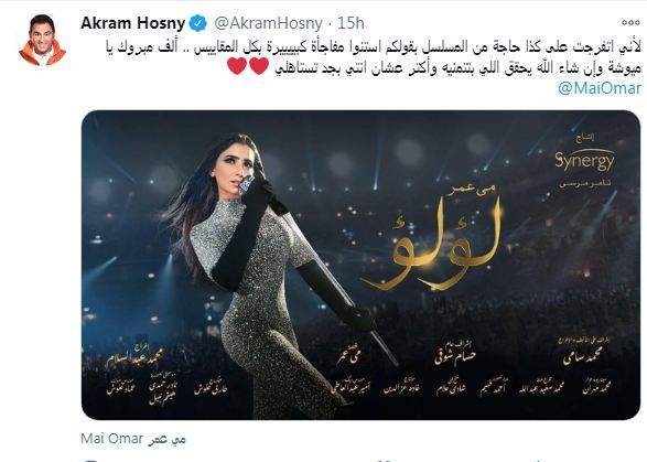 حسني، عبر حسابه الشخصي على موقع التغريدات الشهير "تويتر"، الفنانة مي عمر