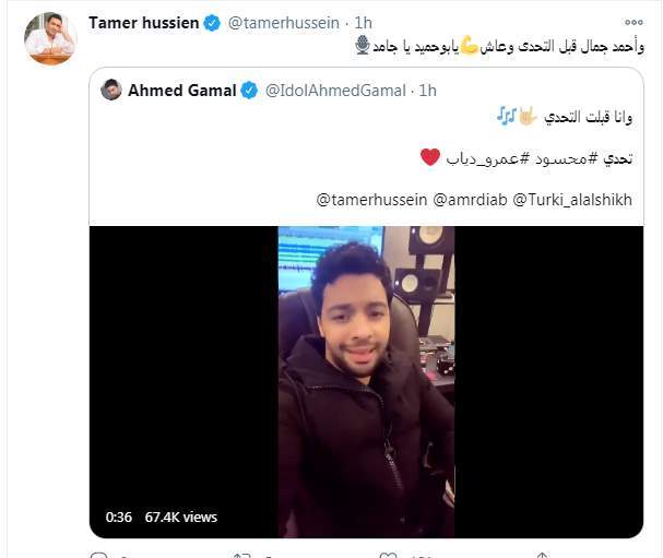 ووجه تامر حسين التحدي لعدد من المطربين " وادى تحدى محسود @amrdiab @KhaledEzz__ @IdolAhmedGamal