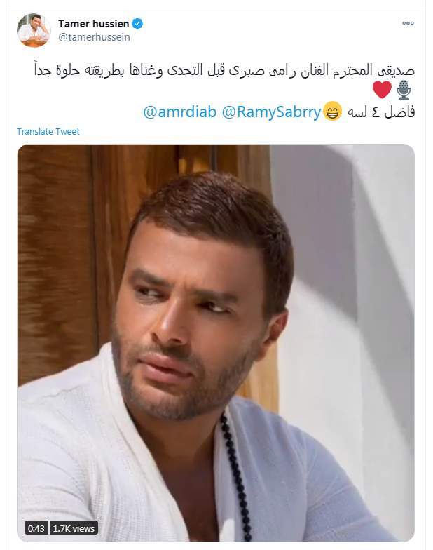 وقبل التحدي رامي صبري وكتب تامر حسين " صديقى المحترم الفنان رامى صبرى قبل التحدى وغناها بطريقته حلوة جداً فاضل ٤ لسه @RamySabrry @amrdiab"