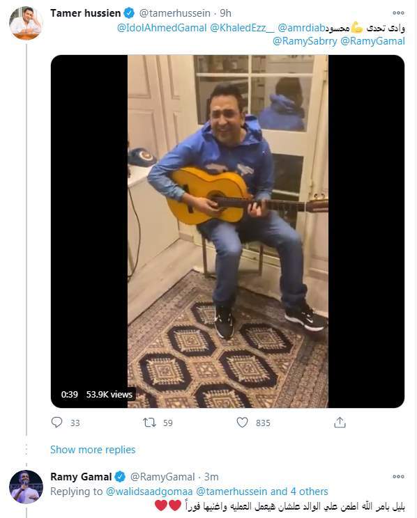 صديقى المحترم الفنان رامى صبرى قبل التحدى وغناها بطريقته حلوة جداً 🎙❤️— Tamer hussien (@tamerhussein) December 16, 2020