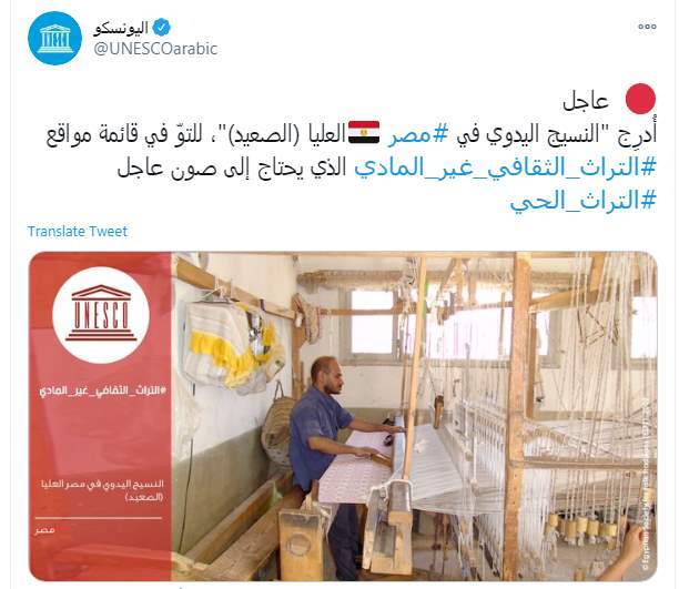 وكتبت اليونسكو تغريدة على تويتر قائلة "عاجل.. أُدرِج "النسيج اليدوي في #مصر 🇪🇬العليا (الصعيد)"، للتوّ في قائمة مواقع #التراث_الثقافي_غير_المادي الذي يحتاج إلى صون عاجل #التراث_الحي"