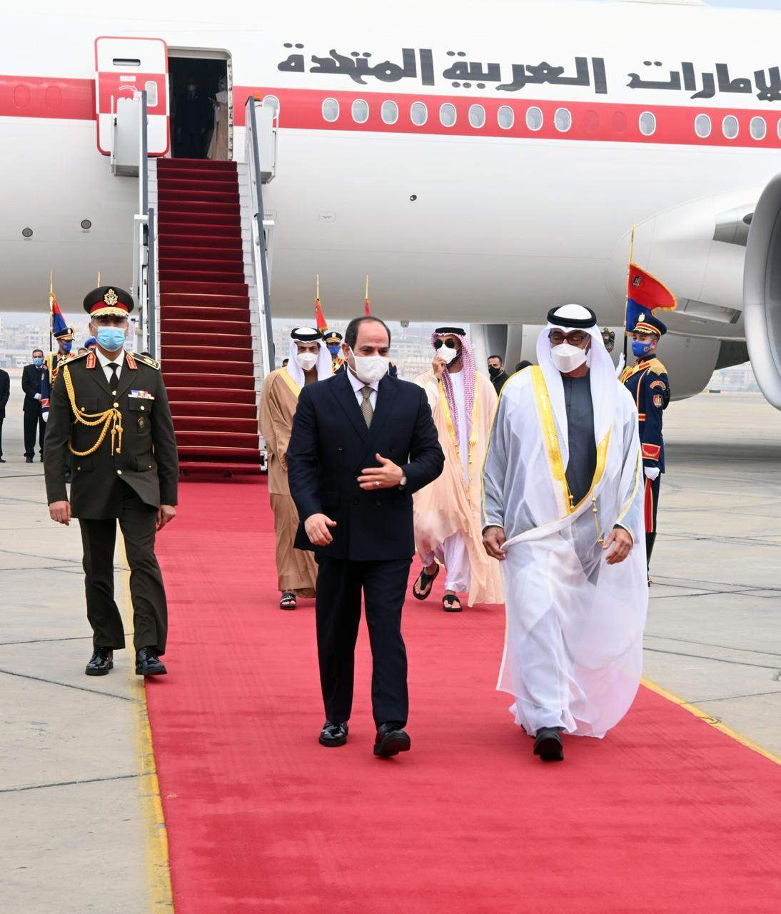 من جانبه؛ أكد الشيخ محمد بن زايد أن زيارته الحالية لمصر تأتي استمراراً لمسيرة العلاقات المتميزة التي تربط البلدين الشقيقين وأهمية استمرار وتيرة التشاور والتنسيق الدوري والمكثف بين مصر والإمارات حول القضايا الإقليمية محل الاهتمام المشترك على أعلى مستوى، بما يعكس التزام البلدين بتعميق التحالف الاستراتيجي الراسخ بينهما، ويعزز من وحدة الصف العربي والإسلامي المشترك في مواجهة مختلف التحديات التي تتعرض لها المنطقة في الوقت الراهن، موضحاً تطلعه لأن تضيف هذه الزيارة قوة دفع اضافية الى الروابط المتينة والممتدة التي تجمع بين الدولتين على المستويين الرسمي والشعبي.