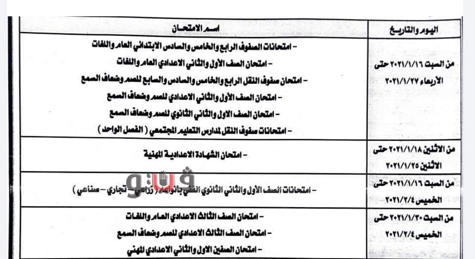 وتبدأ امتحانات الفصل الدراسي الثاني لصفوف النقل والشهادة الإعدادية يوم 15 مايو 2021، على أن تقام امتحانات الدبلومات الفنية يوم 29 مايو 2021، وتقام امتحانات الثانوية العامة يوم 19 يونيو 2021.