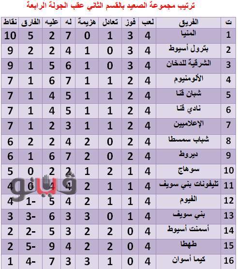 ارتقى الفريق الأول لكرة القدم بنادي المنيا على صدارة جدول ترتيب مجموعة الصعيد بمسابقة دوري القسم الثاني عقب الجولة الرابعة بمشاركة 16 فريقا.