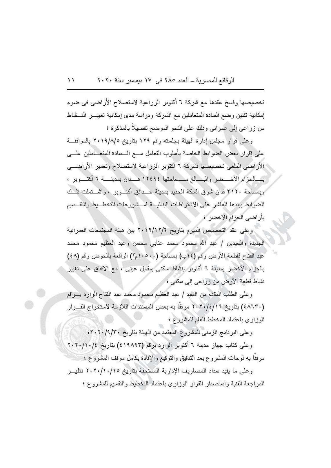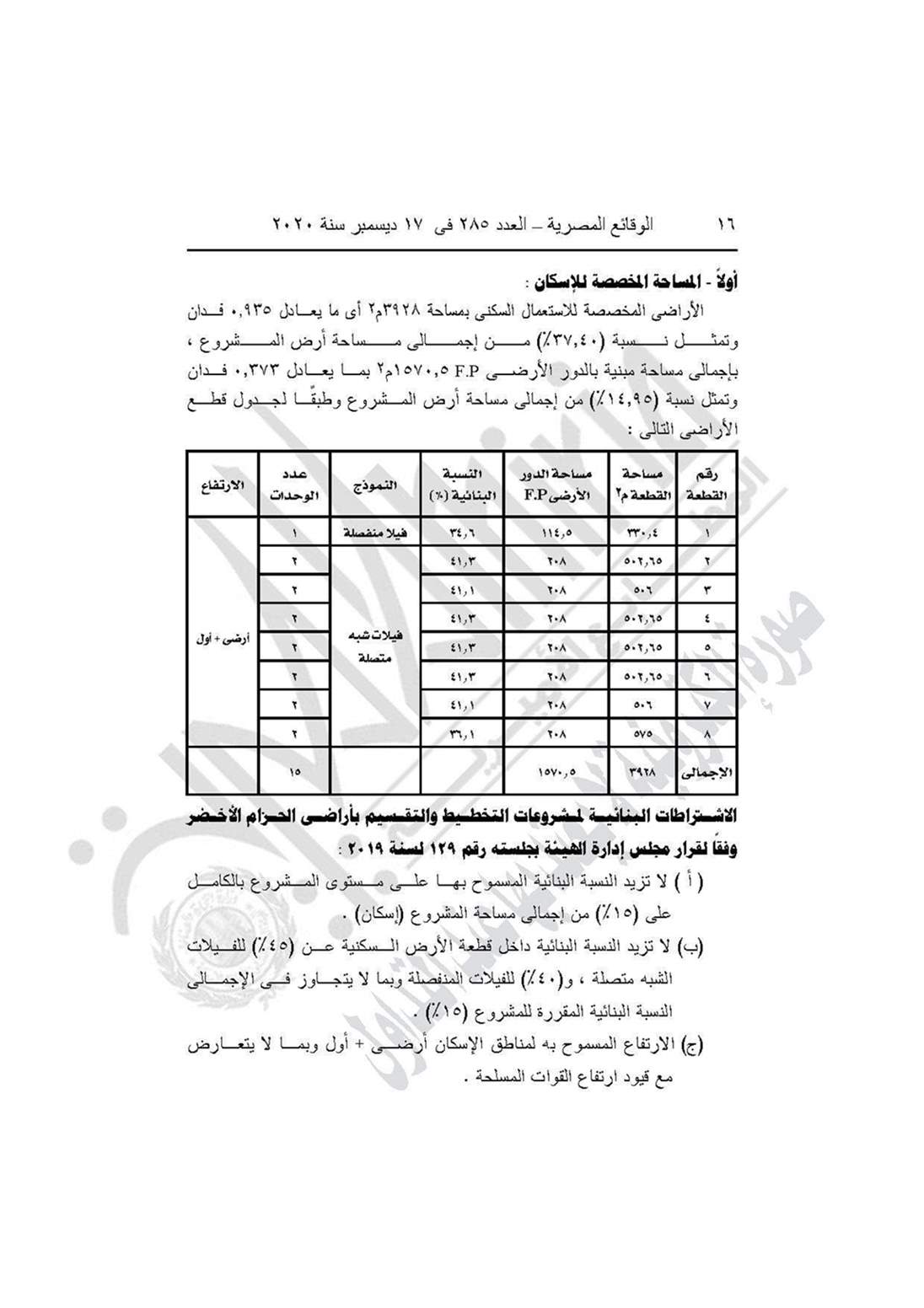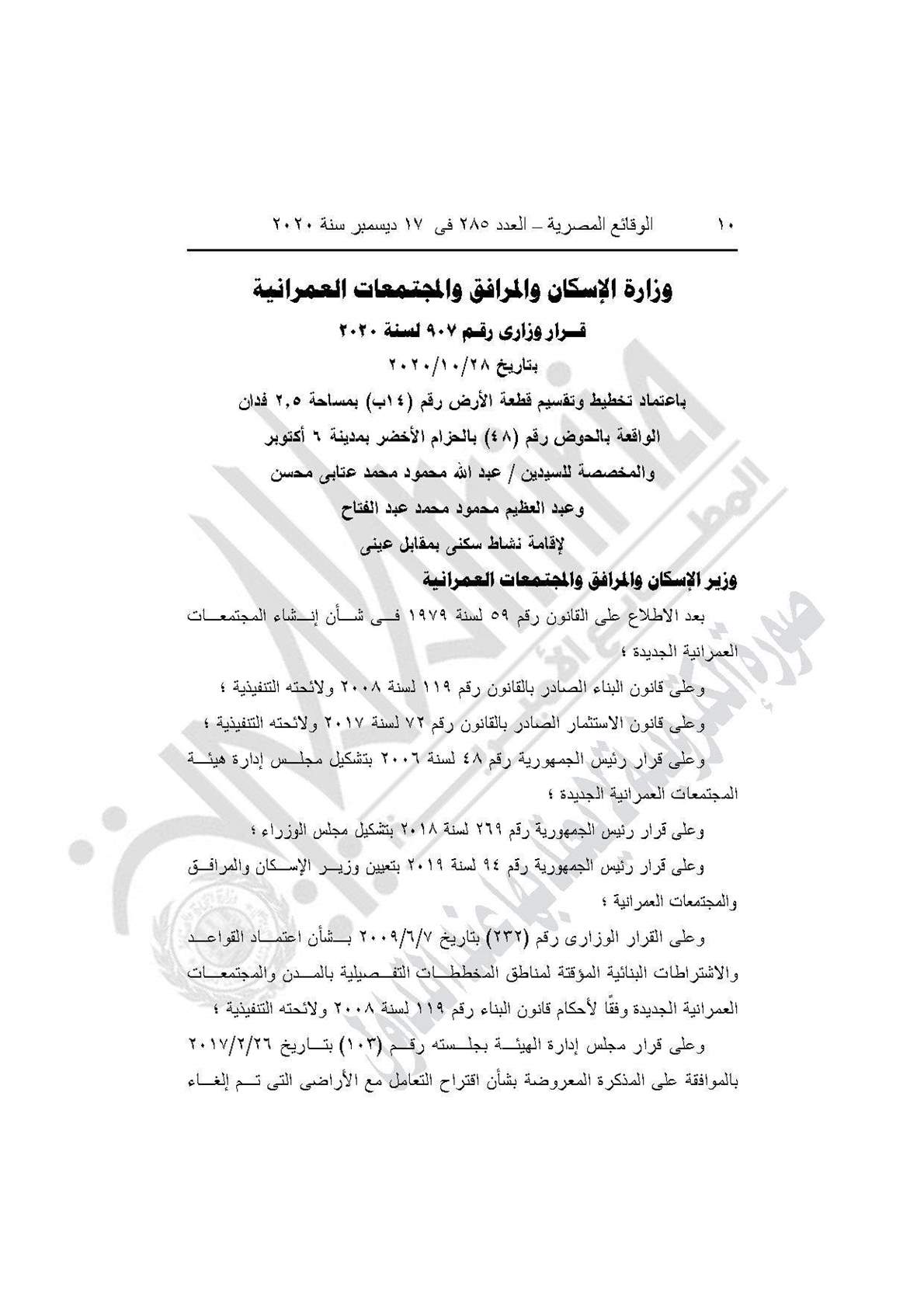 نشرت جريدة الوقائع المصرية في عددها رقم 285، الصادر في 17 ديسمبر 2020، قرار وزارة الإسكان والمرافق والمجتمعات العمرانية رقم 907 لسنة 2020، بشأن اعتماد تخطيط وتقسيم قطعة الأرض بمساحة 2.5 فدان الواقعة بالحزام الأخضر بمدينة 6 أكتوبر، لإقامة نشاط سكنى بمقابل عينى.