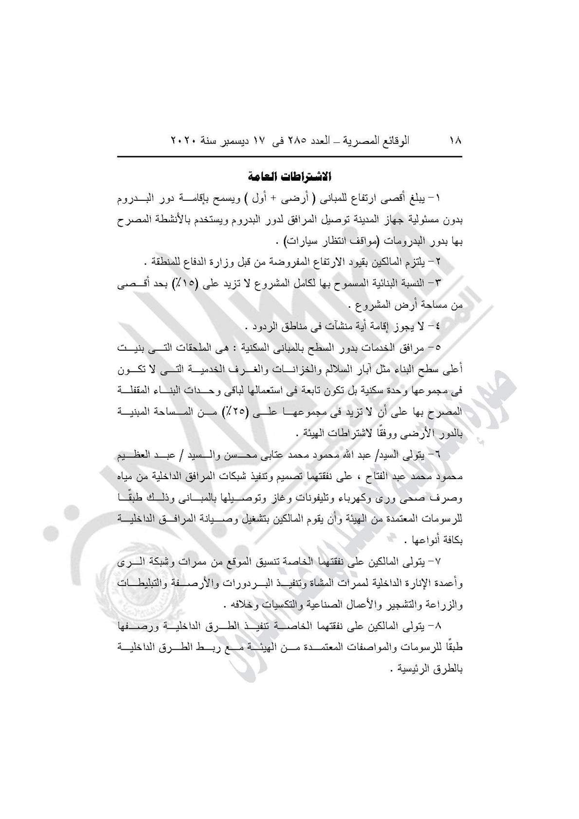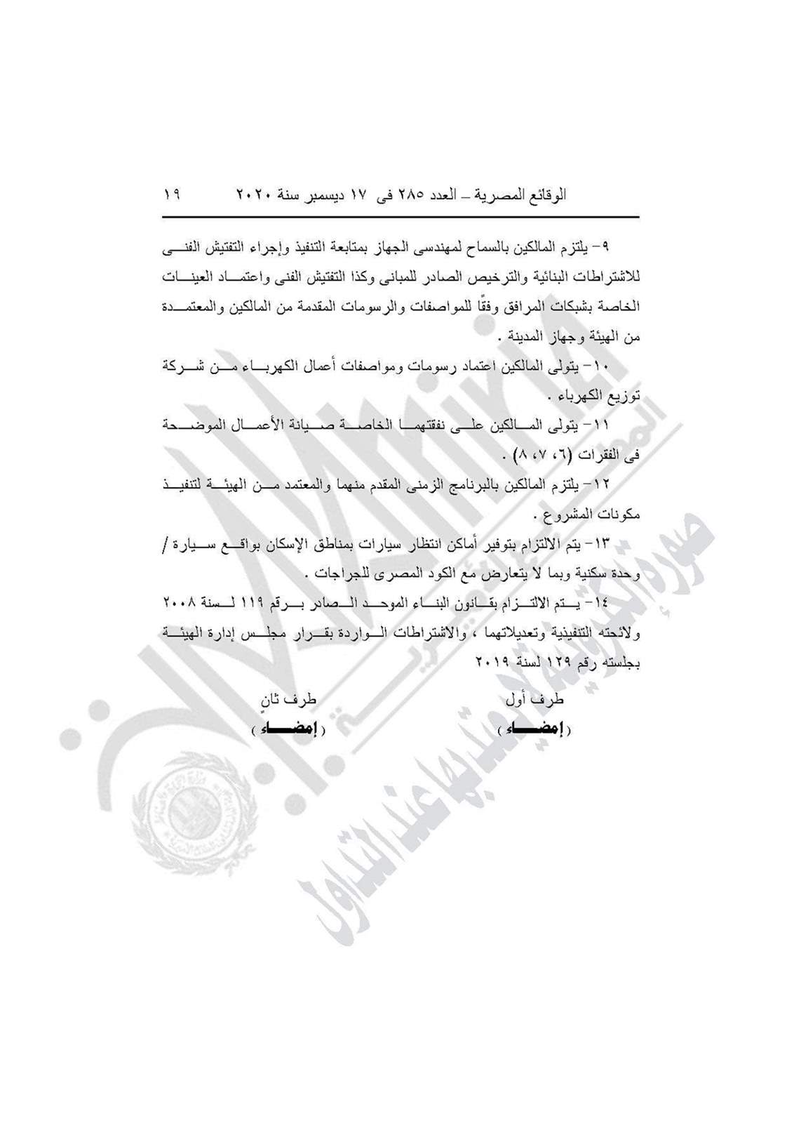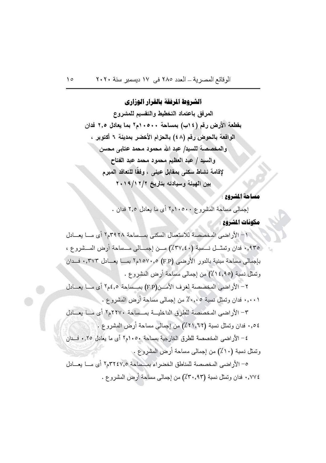 نشرت جريدة الوقائع المصرية في عددها رقم 285، الصادر في 17 ديسمبر 2020، قرار وزارة الإسكان والمرافق والمجتمعات العمرانية رقم 907 لسنة 2020، بشأن اعتماد تخطيط وتقسيم قطعة الأرض بمساحة 2.5 فدان الواقعة بالحزام الأخضر بمدينة 6 أكتوبر، لإقامة نشاط سكنى بمقابل عينى.