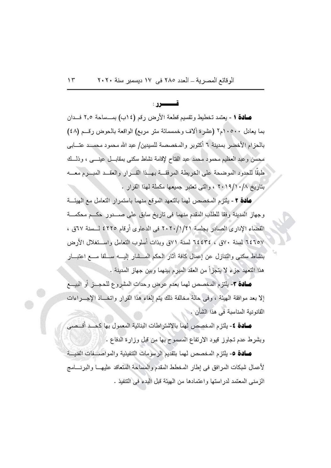 وينص القرار على اعتماد تخطيط وتقسيم قطعة الأرض رقم (14ب) بمساحة 2.5 فدان الواقعة بالحوض رقم (48) بالحزام الأخضر بمدينة 6 أكتوبر، والمخصصة لـ(عبد الله محمود محمد عتابى محسن وعبد العظيم محمود محمد عبد الفتاح) لإقامة نشاط سكنى بمقابل عينى، طبقًا للحدود الموضحة على الخريطة بهذا القرار.