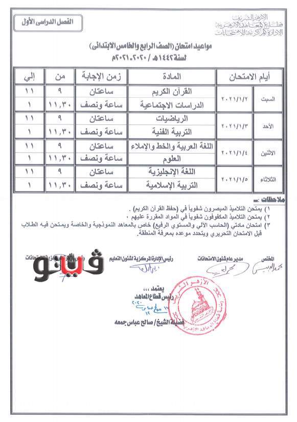 جداول امتحانات النقل والشهادتين الابتدائية والإعدادية الأزهرية
