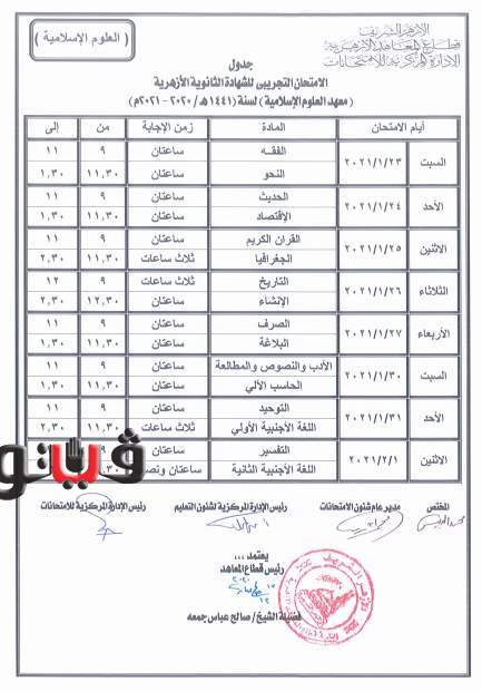 أعلن قطاع المعاهد الأزهرية عن جداول امتحانات صفوف النقل الابتدائي والإعدادي والثانوي والبعوث الإسلامية ومعهد العلوم الإسلامية، لامتحانات الفصل الدراسي الأول 2020-2021، كما أعلن جدول امتحانات الشهادتين الابتدائية والإعدادية.