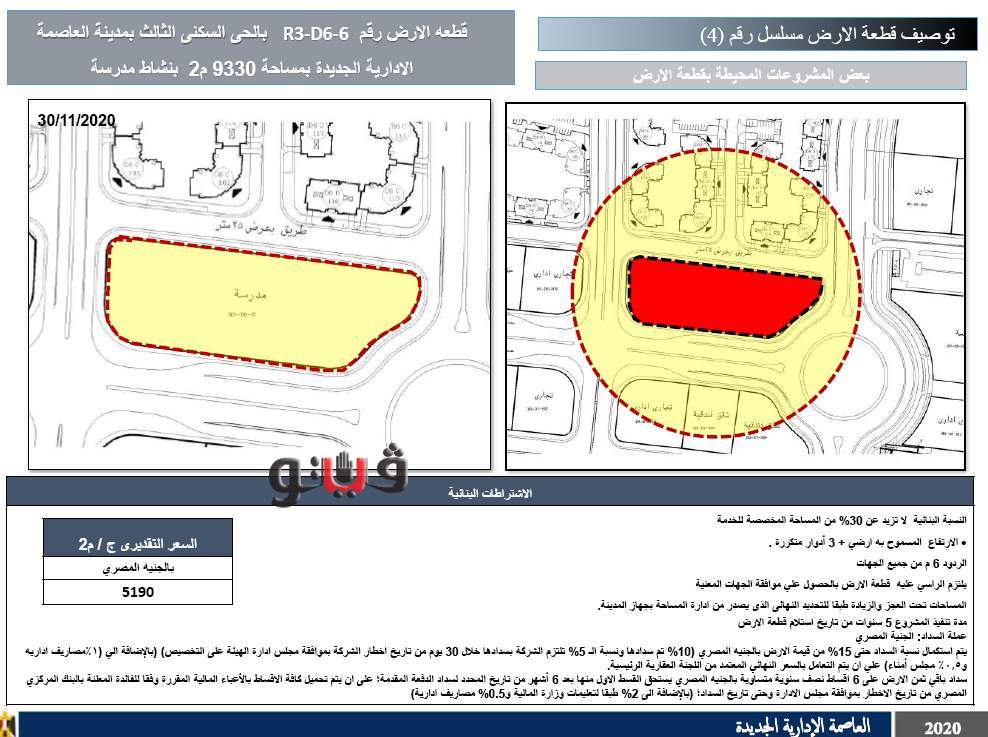 كما تطرح وزارة الاسكان أرضا بمساحة 7209 أمتار وبنشاط تعليمي بسعر 16935 للمتر بقيمة 122 مليون جنيه وأرضا بمساحة 3572 مترا بنشاط اداري بسعر 41800 جنيه للمتر بقيمة 149 مليون جنيه وأرضا بمساحة 4296 مترا بسعر 52400 جنيه للمتر بقيمة 225 مليون جنيه.