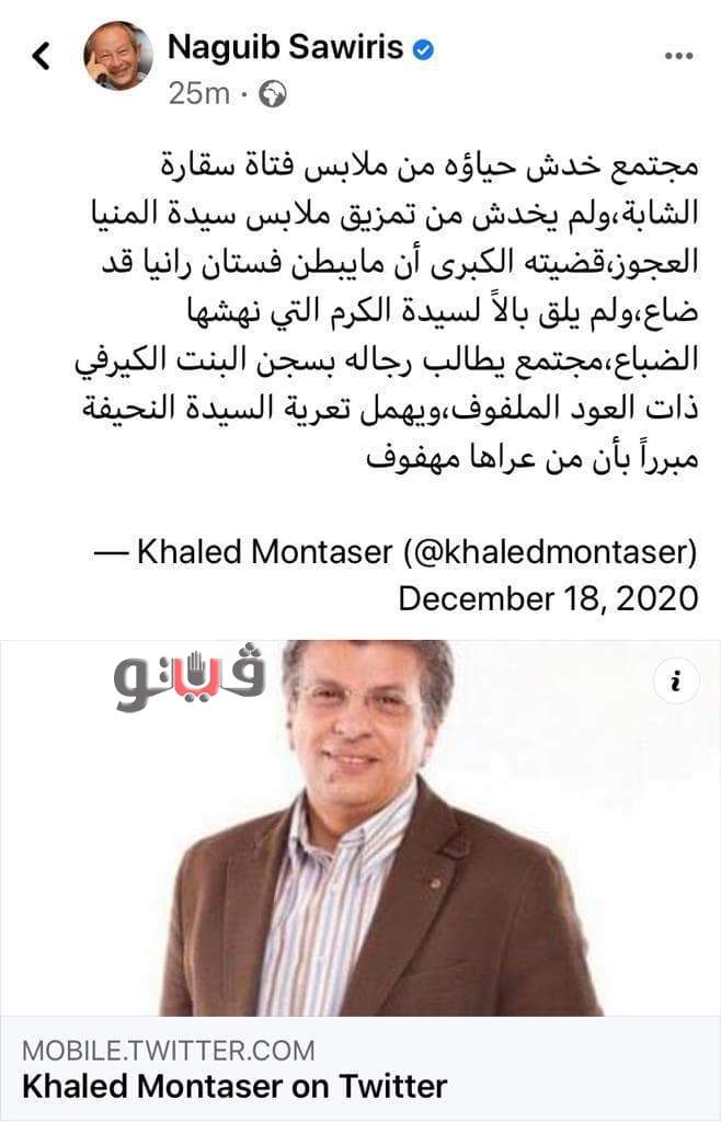 انتقد المفكر والإعلامي الدكتور خالد منتصر، ما وصفه بصمت المجتمع المصري على تعرية سيدة الكرم المنيا بينما ثار غضبا من ملابس فتاة سقارة سلمى الشيمي، قائلا: "إن مجتمع يطالب رجاله بسجن البنت الكيرفي ذات العود الملفوف ويهمل تعرية السيدة النحيفة مبررا بأن من عراها مهفوف".