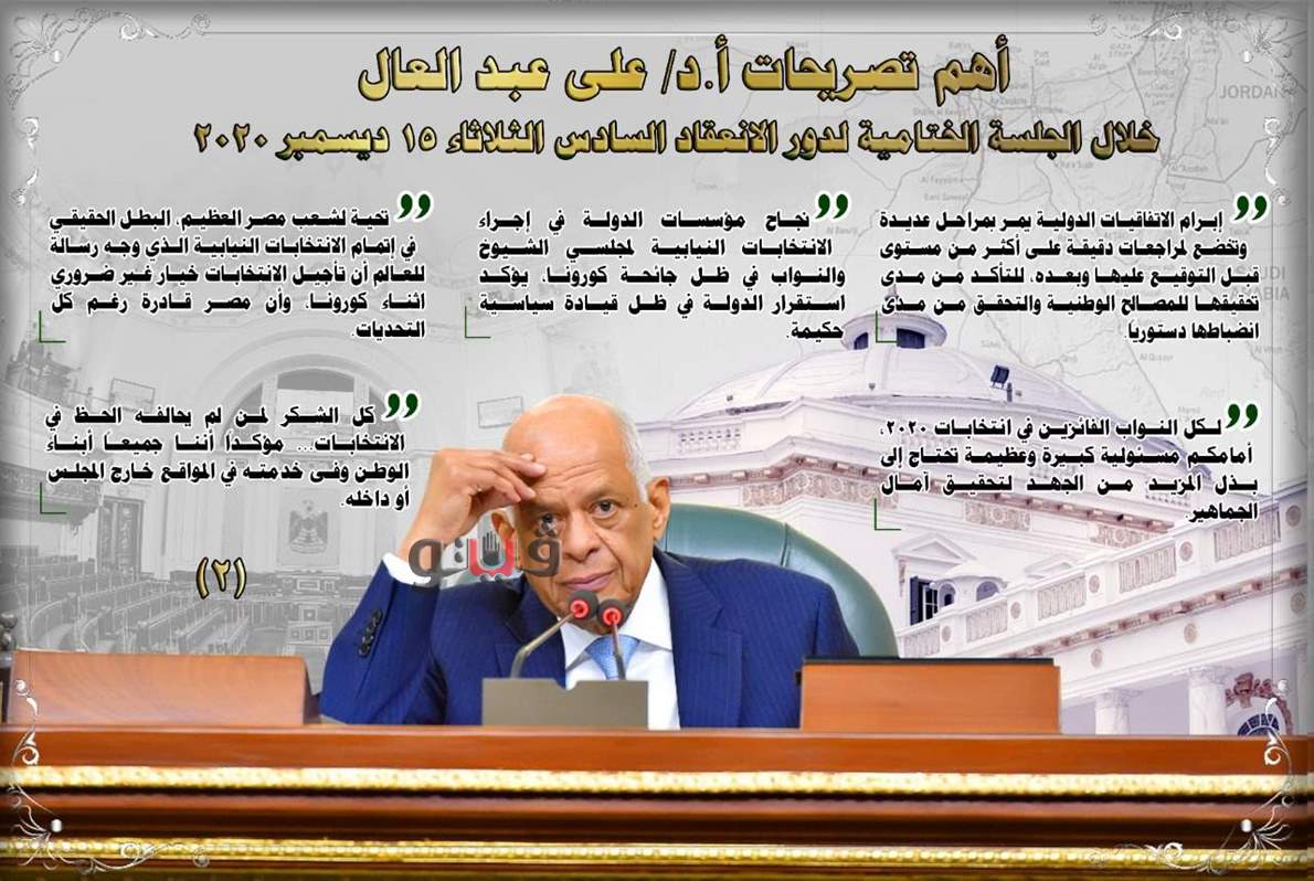 شهدت الجلسة العامة الأخيرة لدور الانعقاد السادس لمجلس النواب، عدد من التصريحات والرسائل الهامة للدكتور على عبد العال رئيس البرلمان.