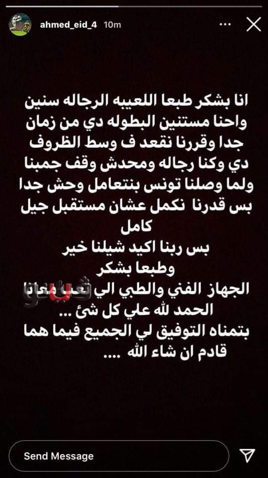 وكتب اللاعب عبر حسابه على إنستجرام: «أنا بشكر طبعًا اللاعبين الرجالة . سنين وإحنا مستنين البطولة دي من زمان جدا وقررنا نقعد فى وسط الظروف دي وكنا رجالة ومحدش وقف جنبنا ولما وصلنا تونس بنتعامل وحش جدًا بس قدرنا نكمل عشان مستقبل جيل كامل. بس ربنا أكيد شيلنا خير وطبعا بشكر الجهاز الفني و الطبي اللي تعب معانا .الحمدلله على كل شيء. بتمني التوفيق للجميع فيما هو قادم ان شاء الله ».