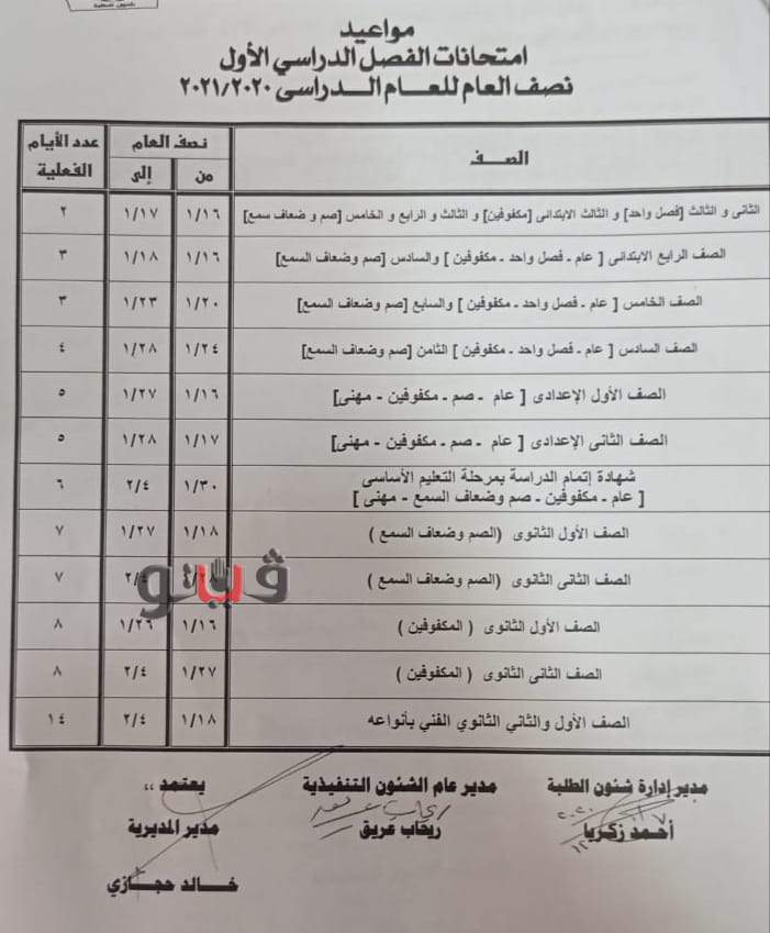 أما عن امتحانات الصف السادس الابتدائى عام ومكفوفين وفصل واحد والصف الثامن (صم وضعاف السمع) فتبدأ من يوم 24 يناير إلى 28 يناير.