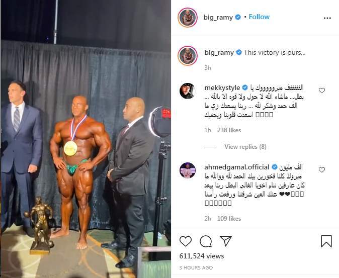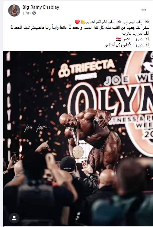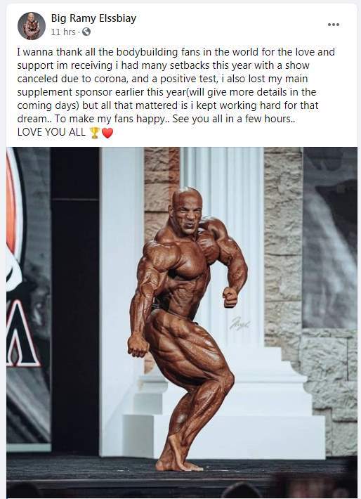 وكان بيج رامى Big ramy كتب تدوينة عبر حسابه بالفيس بوك قبل فوزه بالبطولة "أريد أن أشكر جميع مشجعي كمال الأجسام في العالم على الحب والدعم الذي تلقيته، لقد واجهت العديد من النكسات هذا العام مع إلغاء عرض بسبب كورونا بعد الاختبار الإيجابي".