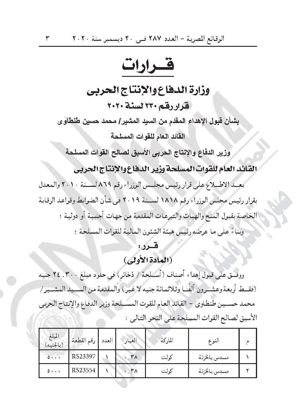 نشرت جريدة الوقائع المصرية في عددها رقم 287، الصادر في 20 ديسمبر 2020، قرار وزارة الدفاع والإنتاج الحربي رقم 230 لسنة 2020، بشأن قبول الإهداء المقدم من المشير محمد حسين طنطاوي، القائد العام للقوات المسلحة ووزير الدفاع والإنتاج الحربي الأسبق، لصالح القوات المسلحة.