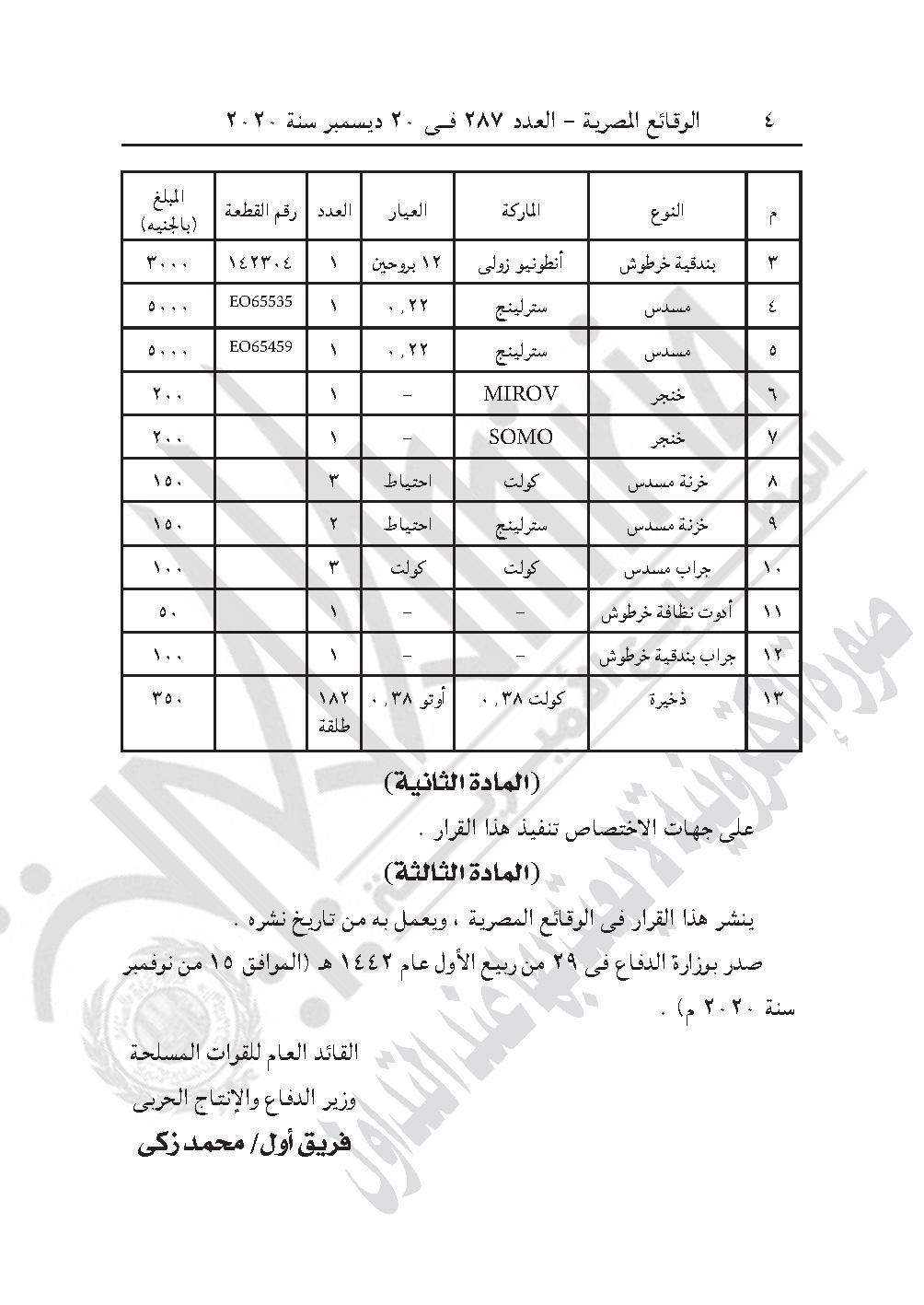 وينص القرار على قبول الإهداء المقدم من المشير محمد حسين طنطاوي، القائد العام للقوات المسلحة ووزير الدفاع والإنتاج الحربي الأسبق، لصالح القوات المسلحة، حيث تم الموافقة على قبول إهداء أصناف (أسلحة وذخائر) في حدود مبلغ 24.300 جنيه والمقدمة من المشير محمد حسين طنطاوي لصالح القوات المسلحة.