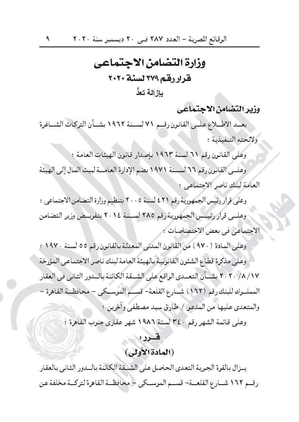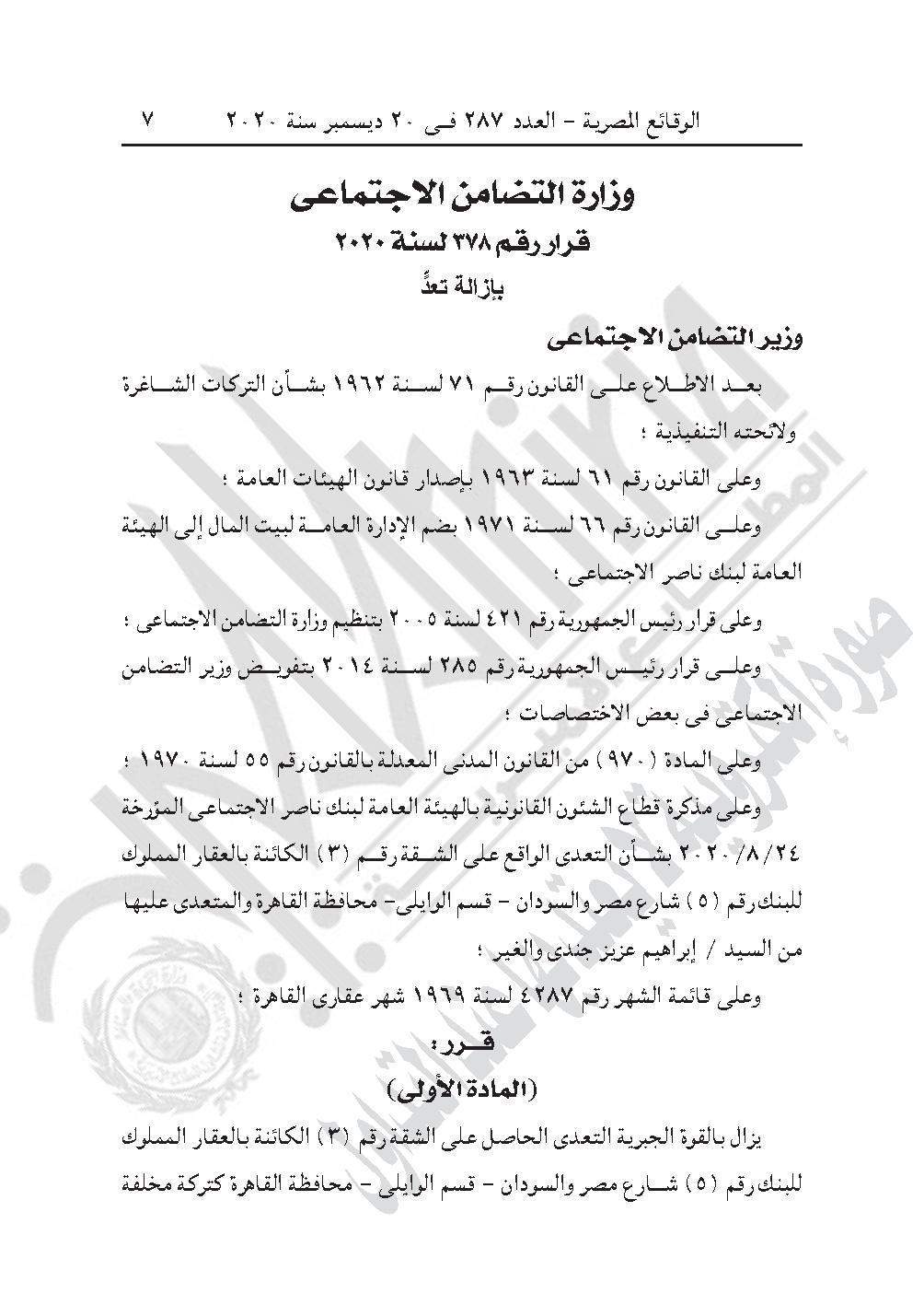 القرار رقم 378 لسنة 2020، بشأن إزالة التعدي بالقوة الجبرية الحاصل على الشقة رقم (3) الكائنة بالعقار المملوك للبنك رقم (5) شارع مصر والسودان قسم الوايلى محافظة القاهرة، كتركة مخلفة عن المرحومة مقبولة عثمان نورى، المتوفاة دون وارث ظاهر والمشهرة بموجب قائمة الشهر رقم 4287 لسنة 1969 شهر عقارى جنوب القاهرة، والمتعدى عليها من إبراهيم عزيز جندى والغير والمبينة الحدود والمعالم والأوصاف بقائمة الشهر رقم 4287 لسنة 1969 شهر عقارى القاهرة، وتسليمها للهيئة العامة لبنك ناصر الاجتماعى خالية من الأشخاص والشواغل.