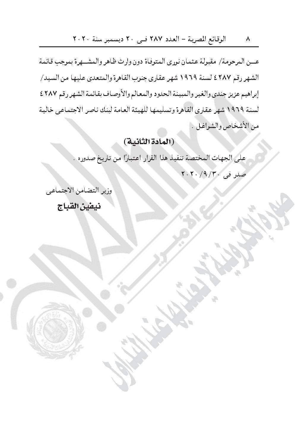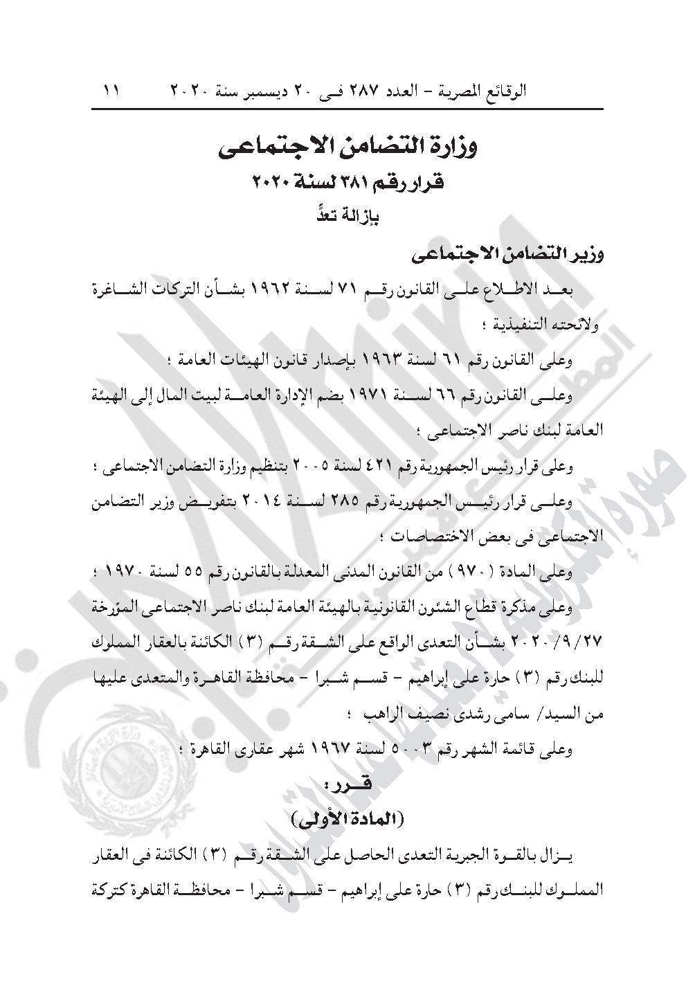 والقرار رقم 381 لسنة 2020، بإزالة التعدي بالقوة الجبرية الحاصل على الشقة رقم (3) الكائنة فى العقار المملوك للبنك رقم (3) حارة على إبراهيم قسم شبرا محافظة القاهرة كتركة مخلفة عن المرحومة ثريا فخرى سليم، المتوفاة دون وارث ظاهر والمشهرة بموجب قائمة الشهر رقم 5003 لسنة 1967 شهر عقارى القاهرة، والمتعدى عليها من سامى رشدى نصيف الراهب، والمبينة الحدود والمعالم والأوصاف بقائمة الشهر رقم 5003 لسنة 1967 شهر عقارى القاهرة، وتسليمها للهيئة العامة لبنك ناصر الاجتماعى خالية من الأشخاص والشواغل.