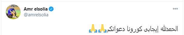 وكتب عمرو السولية تغريدة على تويتر "الحمدلله إيجابى كورونا دعواتكم"