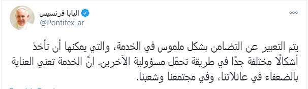 وكتب البابا فرنسيس تغريدة على تويتر "يتم التعبير عن التضامن بشكل ملموس في الخدمة، والتي يمكنها أن تأخذ أشكالًا مختلفة جدًا في طريقة تحمّل مسؤولية الآخرين. إنَّ الخدمة تعني العناية بالضعفاء في عائلاتنا، وفي مجتمعنا وشعبنا"