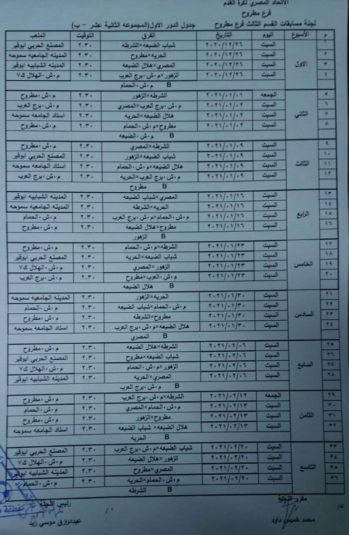 أعلنت منطقة مطروح لكرة القدم، جدول مباريات الدور الأول للمجموعة الثانية عشر "ب" في دوري القسم الثالث لكرة القدم موسم 2020 -2021.