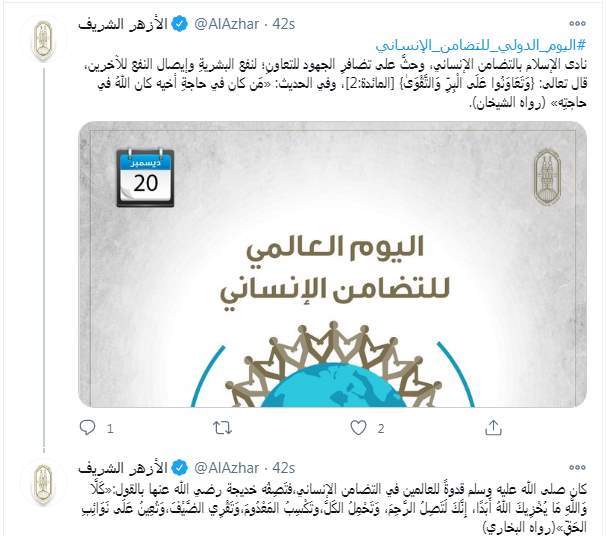 وكتب الأزهر الشريف تغريدة على تويتر"#اليوم_الدولي_للتضامن_الإنساني نادى الإسلام بالتضامن الإنساني، وحثَّ على تضافرِ الجهود للتعاونِ؛ لنفع البشريةِ وإيصال النفع للآخرين، قال تعالى: {وَتَعَاوَنُوا عَلَى الْبِرِّ وَالتَّقْوَىٰ} [المائدة:2]، وفي الحديث: «مَن كان في حاجةِ أخيه كان اللهُ في حاجتِه» (رواه الشيخان)"