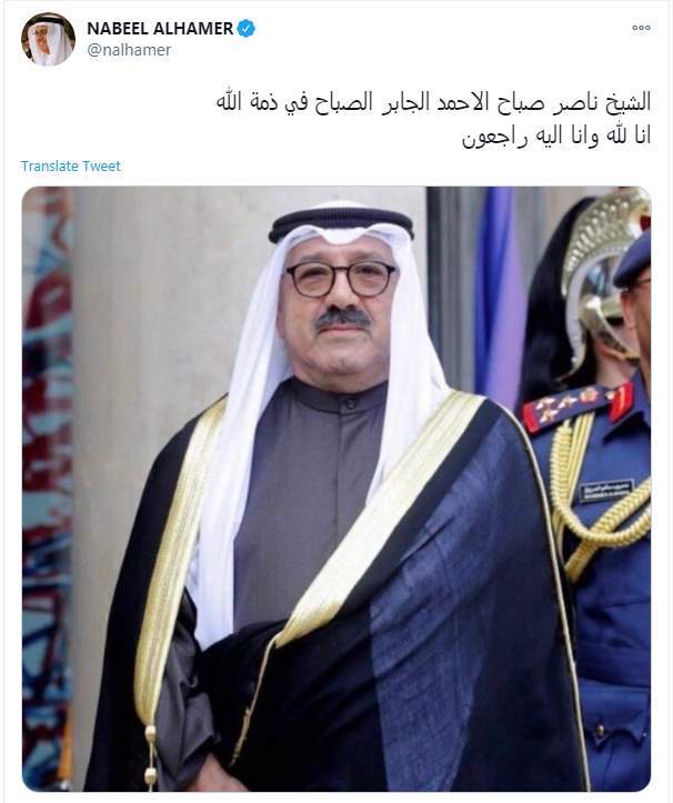 وكتب نبيل الحمر تغريدة على تويتر "الشيخ ناصر صباح الاحمد الجابر الصباح في ذمة الله انا لله وانا اليه راجعون"